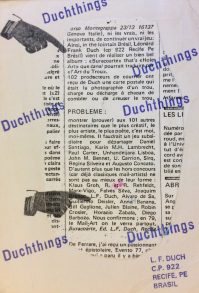 Alguém já disse que a arte correio inverte a equação quantidade/qualidade e que por isso ela não pode ser pensada desde as categorias convencionais. Toda atividade humana produz rejeitos. Eles são o índice da nossa ineficiência como espécie. Da nossa incapacidade de associação. A arte correio é uma fábrica de refugos. E uma máquina associativa. Os seus rejeitos são as grandes obras. Não deveriam ocorrer, mas ocorrem. Sob toneladas de detrito, em meio à multidão sem rostos, elas, vez por outra, ganham os holofotes. Em terras tupiniquins, poucos artistas produziram tão bons trabalhos quanto Leonhard Frank Duch. Suas ‘histórias em quadrinho’ e seus livros de artista são pequenos cristais na imensidão do caos.